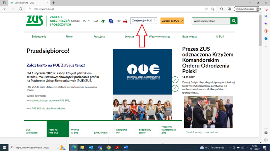 Aby dokonać rejestracji należy wieść na stronę www.zus.pl i wybrać z nagłówka strony zakładkę „Zarejestruj w PUE”.