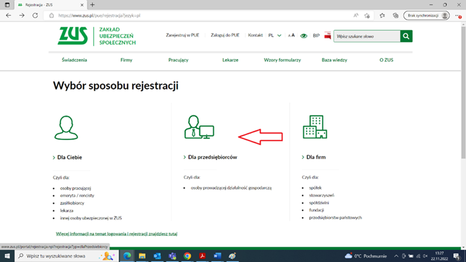 Po kliknięciu „Zarejestruj w PUE” zostaniemy przeniesieni na kolejną stronę, gdzie należy dokonać wyboru podmiotu, dla którego zakładamy konto. Do wyboru mamy rejestrację: [Dla Ciebie], [Dla przedsiębiorców] oraz [Dla firm]. Osoby prowadzące działalność gospodarczą wybierają opcję [dla przedsiębiorców].