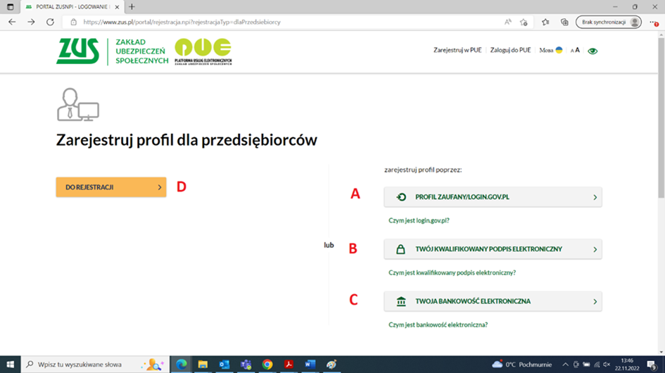 D: samodzielnej rejestracji – dla osób nieposiadających kwalifikowanego podpisu elektronicznego, profilu zaufanego, e-dowodu ani dostępu do systemu bankowości elektronicznej w banku, który podpisał umowę z ZUS. W tym przypadku wybieramy przycisk [DO REJESTRACJI].