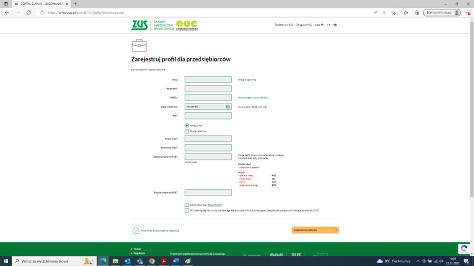 W przypadku skorzystania z opcji [DO REJESTRACJI] wszystkie obowiązkowe pola należy wypełnić samodzielnie a w ciągu 7 dni od rejestracji należy potwierdzić swoją tożsamość w dowolnej placówce ZUS lub podczas e-wizyty. Na wizycie trzeba mieć ze sobą dokument tożsamości – dowód osobisty lub paszport. Pola oznaczone gwiazdką [*] są obowiązkowe.