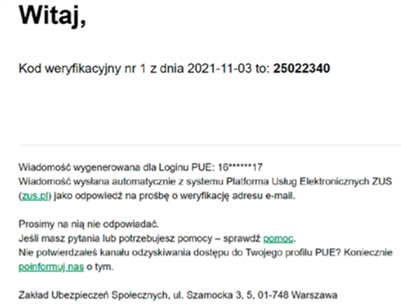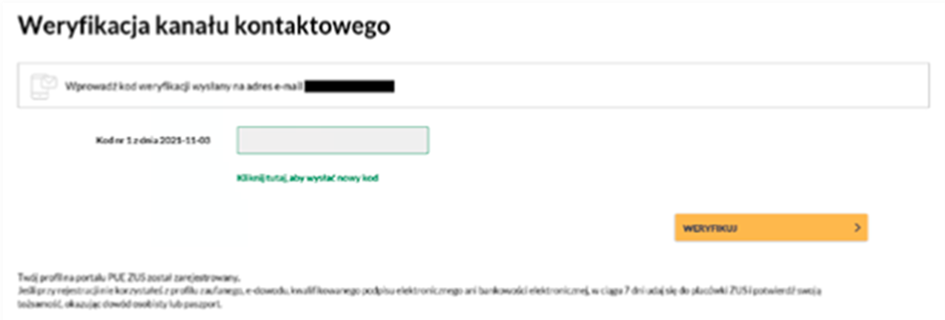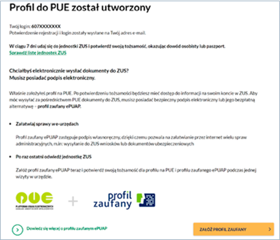 Po wpisaniu kody weryfikacyjnego wyświetli się okno z informacją o pomyślnej rejestracji profilu. ZUS wyśle wiadomość z loginem na adres e-mail albo numer telefonu komórkowego podany w formularzu rejestracyjnym.